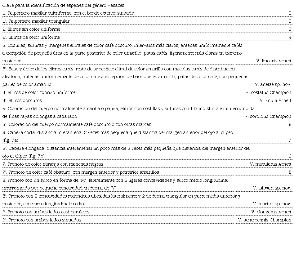 Resumen: Se describen e ilustran 3 especies nuevas de Vasaces de Oaxaca, México: V. martini sp. nov., V. ishwari sp. nov. y V. anelae sp. nov. Se reportan 2 nuevos registros correspondientes a V. aeneipennis Champion, 1890 y V. elongatus Arnett, 1953 para Oaxaca y Querétaro. Se presenta una clave para la identificación de las especies de Vasaces.