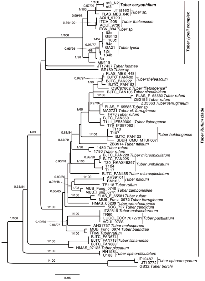 The consensus tree of Bayesian approximation and Maximum likelihood shows the Rufum clade as monophyletic and with high support (BPP = 1, MV = 100). Within this clade, T. caryophilum is an independent, monophyletic and well-supported clade (BPP = 1, MVB = 100). This species appears as the sister clade of T. theleascum (BPP = 0.99, MVB = 98). In turn, these 2 species are grouped with the T. lyonii complex in a well-supported clade (BPP = 1, MVB = 100) made up of species from the southern USA and northern Mexico. Moreover, we found that the ITS sequence of the T. caryophilum holotype had a 99.3% NS (4 substitutions/549 bp) with mycorrhizal sequences from a pecan orchard in Chihuahua. This indicates that, like T. lyonii, T. caryophilum is an ectomycorrhizal symbiont of C. illinoinensis. Consequently, Tuber caryophilum is designated as a new species supported by ITS and LSU phylogenetic analyses of rnDNA, morphological characters, and ecology.