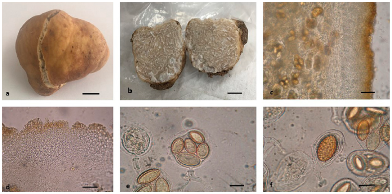 Ascoma. Subglobose to irregular, 19 × 10 × 18 mm, translucent veins on the light brown to dark brown peridium when dry, with a white to cream furrow and an irregular linear or "V"-shaped margin continuing into the gleba as veins, some areas dark brown with cherry tints and with dark brown to reddish insect caverns; peridium smooth, some areas rough, separable from the gleba, without cystidia. White, cream gleba that is gray to dark when dried, marbled with white to gray, dark brown to reddish brown veins that continue towards the peridium (furrows). Strong, very pleasant and distinctive odor, unrecorded taste.