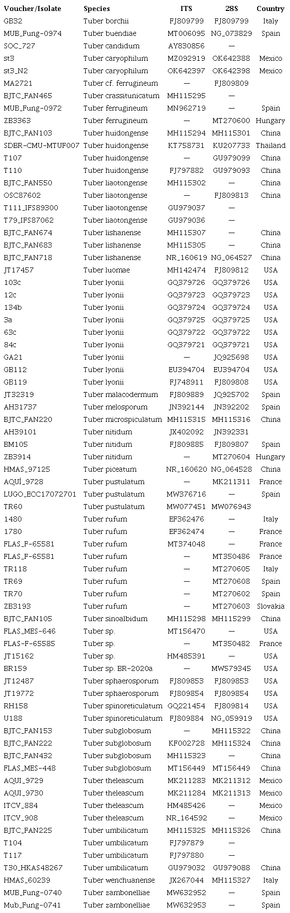Species of the genus Tuber P. Micheli ex F.H. Wigg belong to the family Tuberaceae (Pezizales) and form ectomycorrhizae with many forest tree species (Bonito et al., 2011; Li et al., 2018). These species are ecologically and economically important (Guevara et al., 2013; Neri-Luna et al., 2012). Approximately 86 species of Tuber are known worldwide (Guevara et al., 2013; Kirk et al., 2008). They grow in mycorrhizal symbiotic association with gymnosperm and angiosperm trees. Thirty-eight species of Tuber have been described in North America (Guevara et al., 2013). The diversity of the genus in Mexico is expected to be high because this region is a center of diversification of Quercus Kappelle, Maarten and Pinus Linneo, 2 of the main ectomycorrhizal hosts of Tuber. Knowledge of Tuber in Mexico has recently expanded. For example, new species belonging to the Maculatum clade, such as Tuber castilloi Guevara, Bonito & Trappe, T. guevarai Bonito & Trappe (Guevara et al., 2013), Tuber mexiusanum Guevara, Bonito & Trappe (Guevara et al., 2013), T. mixtecorum J. García, Ayala Vázquez & de la Fuente (García-Jiménez et al., 2021) and T. theleascum M. Leonardi, A. Paz, G. Guevara & Pacioni (Leonardi et al., 2019) associated with Quercus spp., have been described in northeastern Mexico. Tuber incognitum and T. anniae belonging to the Puberulum clade have also been recorded in association with Quercus spp and Pinus montezumae in central Mexico (Piña-Páez et al., 2018). In association with trees of forest interest in Mexican ecosystems, T. guzmanii, T. separans, and T. pseudoseparans have also been found (Gómez-Reyes et al., 2018; Guevara et al., 2015; Piña-Páez et al., 2018).