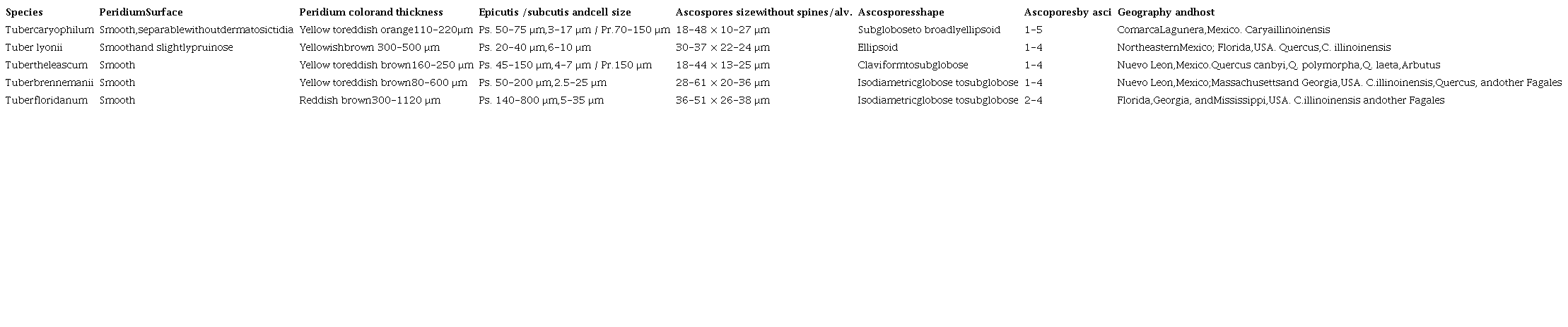Phylogenetic analyses show that Tuber caryophilum belongs to the Rufum clade and, together with T. theleascum (ITS NS = 93.6-93-9%), is related (ITS NS = 90.4-93.1%) to the T. lyonii complex, which is also an ectomycorrhizal species of Carya illinoinensis. Tuber caryophilum differs from T. theleascum because the latter has ascomata without translucent areas on the peridium, a pseudoparenchymatous epicutis with elongated prostrate or intertwined hyphae 4-7 μm wide and smooth, while the former species has translucent areas on the peridium and a pseudoparenchymatous epicutis with isodiametric hyphae 13-17 μm wide. Furthermore, they differ in ascospores size; T. caryophilum has 18-48 × 10-27 μm ascospores, whereas in T. theleascum they are 18-44 × 13-25 μm. Tuber caryophilum is also similar to T. lyonii, an edible truffle species native to the southeastern USA (Bonito et al., 2013; Sharma et al., 2012). However, they differ macro- and microscopically; in T. lyonii, peridium width is larger (300-500 μm), ascospores are ellipsoid 30-37 × 22-24 μm and epicutis width is 20-40 μm, with hyphae 6-10 μm wide (Healy et al., 2016; Sharma et al., 2012). In contrast, in T. caryophilum, the peridium width is 110-220 μm, its ascospores are 18-48 × 10-27 μm and epicutis width is 50-75 μm, with 3-17 μm hyphae. These 3 species share important microscopic features such as the pseudoparenchymatous peridium surface and most of their ascospores are subglobose to ellipsoid. Other common features are that all 3 are closely related in the same clade of the Rufum section and that they develop in pecan orchards (Grupe et al., 2018; Sharma et al., 2012; Trappe et al., 1996).