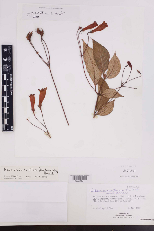 In 1975 Wiehler re-established Moussonia as a genus distinct from kohleria, and included M. triflora (M.Martens & Galeotti) Hanst., indicating again Gesneria triflora M.Martens & Galeotti as the basionym and K. martensii as a synonym. No mention of a type or any other specimen was given.