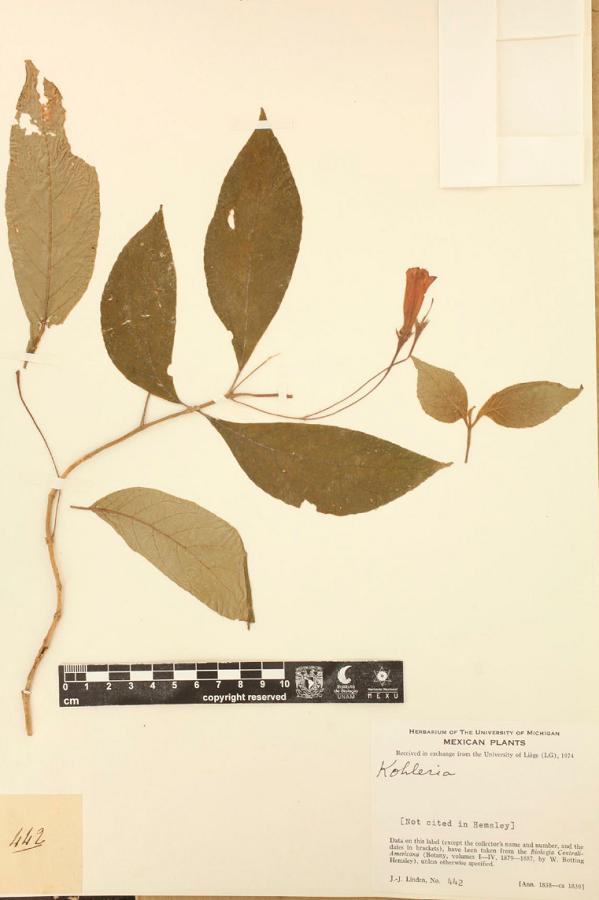 Finally, in the revision of the genus Moussonia,Ramírez-Roa (2017) included M. triflora as 1 of the 23 recognized species, mentioning that the author was unable to locate neither the type specimen supposedly collected by Galeotti nor the specimen Seler & Seler 5182 reported by Fritsch (1913) and Morton (1967) under Kohleria martensii. However, new information about their Galeotti's and Linden's travels in México, and their location of their collections now make it possible to propose the lectotypification of M. triflora in this work. An amended description is provided below, as well as additional specimens and images not included in the 2017 work.