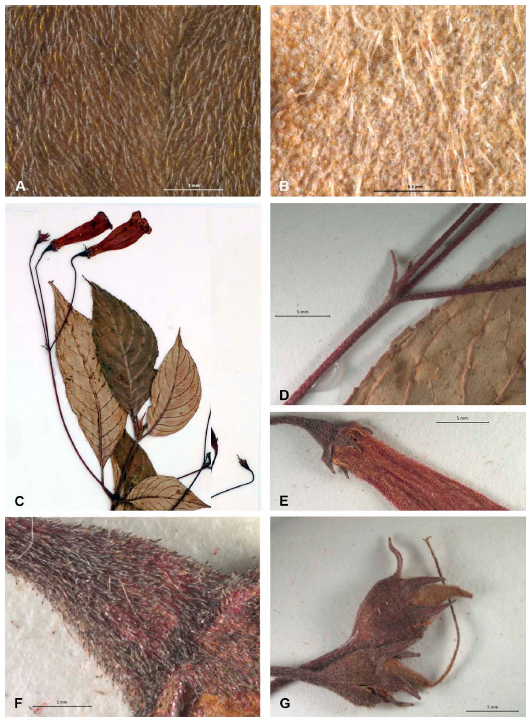 Subshrubs 0.2-2 m in height, with pendulous flexible stems, generally reddish, investiture pubescent to pubescence of lax acroscopic trichomes, but also appearing to be almost glabrous, the few lenticels ellipsoid, flat, almost imperceptibly reddish. Leaves opposite, elliptic-lanceolate to elliptic, sometimes elliptic-obovate, moderately anisophyllous, asymmetric, larger blades in a pair 7.5-15 cm long, 2.7-5.8 cm wide, smaller blades 4.5-5.5 cm long, 2-2.7 cm broad, herbaceous when fresh, apex acuminate, base generally attenuated, oblique, margin shortly serrate towards the apex, ciliate, upper surface dark green to greenish-brown, investiture strigillose, with lax cream-colored trichomes (fig. 5A), underside sparsely to densely strigillose to strigose on veins, greyish-green or yellowish-brown to reddish-brown (fig. 5B), veins cream-colored, secondary veins 7-9; petioles 0.7-3.5 cm long, canaliculate, appressed-pilose. Inflorescences of umbellate cymes of 3 flowers on most of the plant (rarely fewer) (fig. 5C); peduncles (3.5-) 5-11.4 cm long, slender, generally reddish, pubescent-velutinous to shortly velutinous with acroscopic trichomes; pedicels 3.3-6.5 cm, slender, generally reddish, shortly velutinous with acroscopic trichomes, trichomes generally with reddish walls; bracts subulate to ensiform (fig. 5D) 3-10 mm long, 0.5-1 mm wide. Flowers with the floral tube obconic, 2.5-6 mm long, 2.5-3 mm wide, reddish to greenish-brown, hirsute-tomentose to hirsutulous with acroscopic trichomes (fig. 5E-F); calyx lobes deltoid (fig. 5E) to triangular-lanceolate, 2.5-5 mm long, 1.5-3 mm wide, hirsute to hirsutulous with acroscopic trichomes, reddish to greenish-brown; corollas tubular, 2.4-3.5 cm long, almost erect in the calyx, tube 2-2.8 cm long, 4-5 mm wide at the base, ampliate towards the limb, more or less ventricose, throat slightly constricted, 0.8-1.2 cm wide at the throat, red-orange, not translucent, densely hirsute to hirsutulous outside, generally with reddish trichomes, throat yellow, with red elongated maculae; corolla lobes 3-5.5 mm high, obovate, slightly elongate, reddish-orange with reddish lines, margin erose; stamens 2.4-3 cm long, exserted, filaments and anthers yellowish; nectary annular, 5-lobed; ovary sericeous with whitish trichomes, style 2.42.7 cm long; stigma stomatomorphic. Fruit an ellipsoid-rostrate capsule (fig. 5G), 1-1.5 cm long, 3-6 mm wide, ribbed, dry, brown, investiture hirsute-tomentose, with acroscopic hyaline to reddish trichomes, or glabrescent; seeds elliptic, 0.4-0.6 mm long, 0.1-0.2 mm wide, striate, reddish-brown.