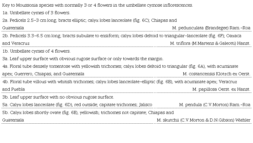 Although the name of Moussonia triflora indicates the presence of an inflorescence with 3 flowers in each cyme, it is not the only species in Moussonia that might have 3-flowered cymes, for example the recently published, M. pedunculata (Brandegee) Ram.-Roa (Ramirez-Roa & Skog, 2021) has 3 flowers. It is important to note that one may see 3 flowers in any cyme of any branch of species which normally have cymes of 4 flowers, as the fourth flower may not develop (Ramírez-Roa, 2017). The following key may help to distinguish M. triflora from other species with 3 and 4 flowers per cyme.