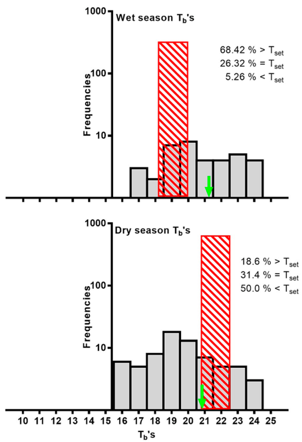 Body temperature from individuals captured at the university campus differed among seasons (t = 2.666; p = 0.0095). The body temperature of these individuals was not related to body size (r2 = 0.0076). Additionally, when we compared separately wet and dry seasons among different years (wet season 2014 (n = 14) vs. wet season 2015 (n = 24); dry season 2015 (n = 36) vs. dry season 2019 (n = 34), and wet season 2014 and dry season 2015, we found Tb was different (Mann Whitney U = 76.50, p = 0.0392; U = 90.50, p = 0.0389, and U = 492, p < 0.0001, respectively). In contrast, no significant differences were found between wet and dry season of the same year (i.e., El Niño year 2015) (Mann Whitney U = 196.5, p = 0.7512). Additionally, during twilight, between 17:30 and 19:00 h, Tb was within or close to Tsel interval (Fig. 1).