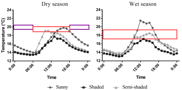 Comparing models exposed to direct sunlight versus models under shade, we found seasonal differences in both, rocky refuges (t = 5.5978; p < 0.001, n = 11652) and in grass near rocks (t = -2.5854; p = 0.00973, n = 25346). Higher Te’s are usually observed in sunny microhabitats in both seasons (Table 1, Fig. 1). During the dry season, higher values of Te’s are observed from 12:00 to 18:00h. On the other hand, during the wet season higher Te’s are between 11:00 to 12:00h and 14:00 to 17:00h.