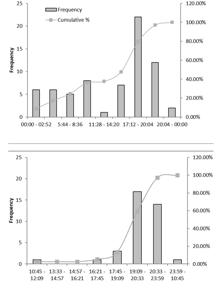 The data of Tb, Te, and db and de indices, that met the requirements for the use of parametric tests (normality and homogeneity; Shapiro-Wilk and Levene’s Tests, respectively), were compared using t-tests of Student; otherwise, the corresponding non-parametric test was used (Mann-Whitney U test). We used a Student t-test with Welch correction, given their dissimilar standard deviation, to compare Te between 2 seasons. This test was also used to contrast Tsel between seasons. PAST3 and Graphpad Prism 6 software were used for statistical analysis and graphing. The significance value for all statistical tests was p < 0.05 (Sokal & Rholf, 2000). Average ± standard deviation (SD), sample size (n), and the range between the minimum and maximum values are shown within text and figures.