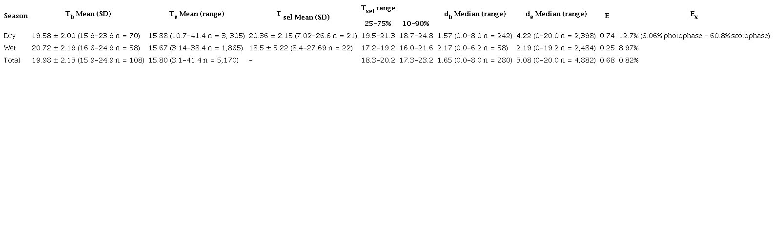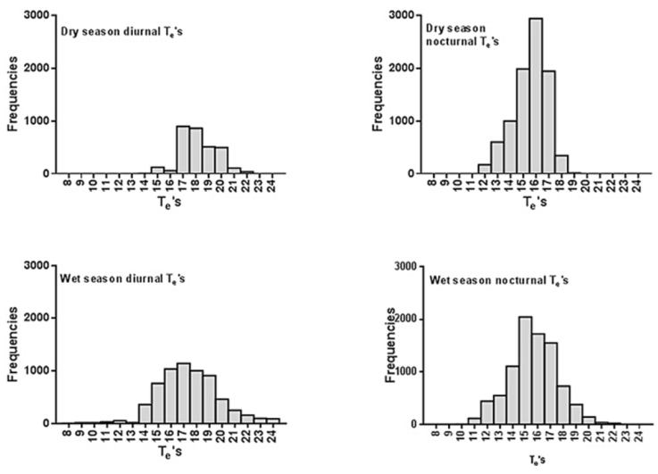 Operative temperatures differ among seasons (Mann Whitney U = 2.76 × 106; p < 0.0001, n = 5170). However, differences are minor if we examine the median and range values of Te per season (Table 1), with difference below 0.5 ºC. Interestingly, when we compared separately day (photophase) and night (scotophase), we found that dry season days were significantly hotter than wet season days (Mann Whitney’s U = 7.77x106, p = 0.0001, n = 9600). During the nights of the dry season there were not significant differences from the nights of the wet season (Mann Whitney’s U = 3.93x107, p = 0.1197, n = 17861). Also, there is a difference between day and night in the dry season (Mann Whitney U = 2.17 × 106; p < 0.0001, n = 12120), and during the wet season (U = 1.54 x107; p < 0.0001, n = 15341) (Appendix 4).
