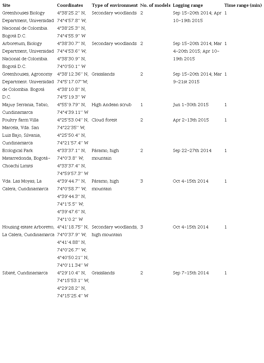 We recorded field body temperature (Tb) of snakes from a population at the campus of the Universidad Nacional de Colombia located in Bogotá D.C., Cundinamarca at 2,630 m asl. We recorded additional Tb’s in Sibaté, Cundinamarca at 2,700 m asl., and 27 km southeast of the capital city (Bogotá). The weather in the Cundinamarca/ Boyacá plateau is moderately wet with 2 rainy seasons -April to May, and October to November- with mean annual precipitation of 1,000-1,500 mm (Pabón-Caicedo et al., 2001). Likewise, the multi-annual mean temperature is 14-14.5 °C, and the lower mean temperatures are observed in the December-February trimester; conversely, the highest temperatures occur in April-May, and October-November rainy months (Benavidez & Rocha, 2012; Hurtado, 2012).