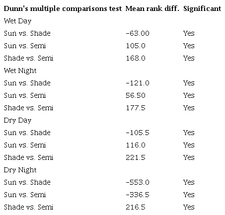 Therefore, the thermal quality -de- (including all models, under shady and sunny conditions) varied seasonally (Mann Whitney U = 1.622 × 106; p < 0.0001; n = 4882). Besides, days have better thermal quality (dry day de = 2.96 and humid day de = 1.78) than nights (dry night de = 4.8 and humid night de = 3.0), and difference is significant both during dry season (dry day vs. humid day U = 488129, p < 0.0001, n = 2457) and wet season (dry night vs. humid night U = 280459, p < 0.0001, n = 2425). We compared Te among full sun, partial sun and shade microenvironments and found significant differences in both seasons (Dunn’s multiple comparison’s, Appendix 5), with partial sun microenvironments having highest thermal quality, particularly during daylight hours (photophase) in wet season (Fig. 2).