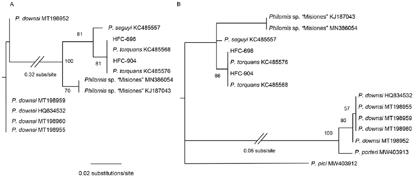 We extracted, amplified, and sequenced DNA from larvae found in 14 individuals. However, the DNA in the larvae of 8 individuals was degraded because their preserving ethanol evaporated during at least part of the storage period. Thus, we were able to obtain ITS2 sequences for larvae found on 6 individuals: 1 T. aedon, 1 G. plebejus, and 4 Z. capensis (GenBank accession numbers MW853826- MW853831). From the sequences of these 6 larvae, we obtained 2 unique haplotypes, A and B (different by 1 indel; Table 1) identified by BLAST as belonging to P. torquans. Also, phylogenetically, they were placed within the P. torquans clade (Fig. 2A, B), which was sister to the only available haplotype of P. seguyi in the reduced-dataset tree (Fig. 2A). In that same tree, Philornis sp. "Misiones" showed as sister to P. seguyi + P. torquans. We also found a few mostly unambiguous indels (Fig. 3) that may prove phylogenetically informative in the future, when more extensive haplotype sampling is available. The sequences obtained in this study allowed us to identify the sampled larvae as part of the P. torquans complex that includes both P. torquans and P. seguyi (Quiroga et al., 2016; see Discussion).