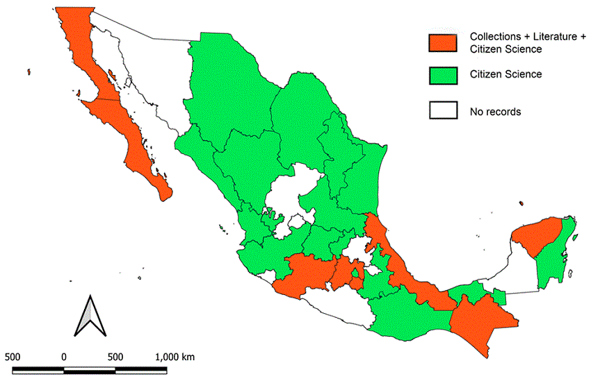 Using the combined data from citizen science, social media and literature records we reported the Oriental latrine blow fly for 25 out of the 32 federal states of Mexico: Baja California, Baja California Sur, Chiapas, Chihuahua, Coahuila, Ciudad de México, Durango, Estado de México, Guanajuato, Jalisco, Michoacán, Morelos, Nayarit, Nuevo León, Oaxaca, Puebla, Querétaro, Quintana Roo, San Luis Potosí, Sinaloa, Sonora, Tabasco, Tamaulipas, Veracruz and Yucatán. In other words, C. megacephala has at least 1 record in the 75% of the Mexican states, contrary to the previously 25% reported from literature and entomological collections.