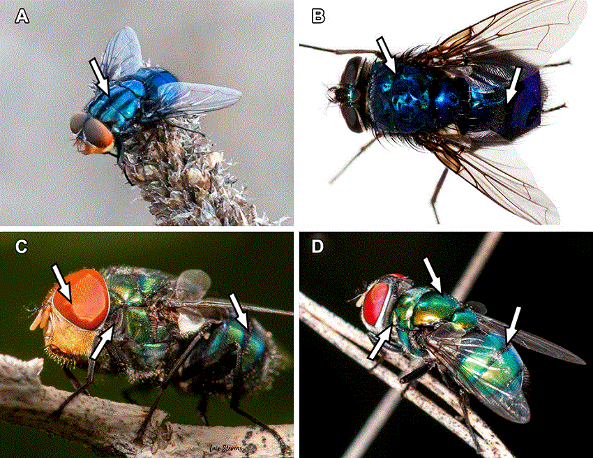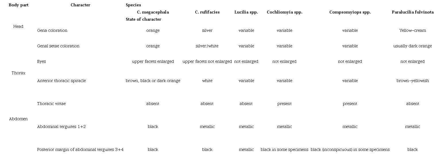 We provide an easy-to-follow guide to identify Chrysomya megacepahala in pictures and to differentiate this species from other Calliphoridae species commonly found in Mexico (Fig. 2, Table 1).