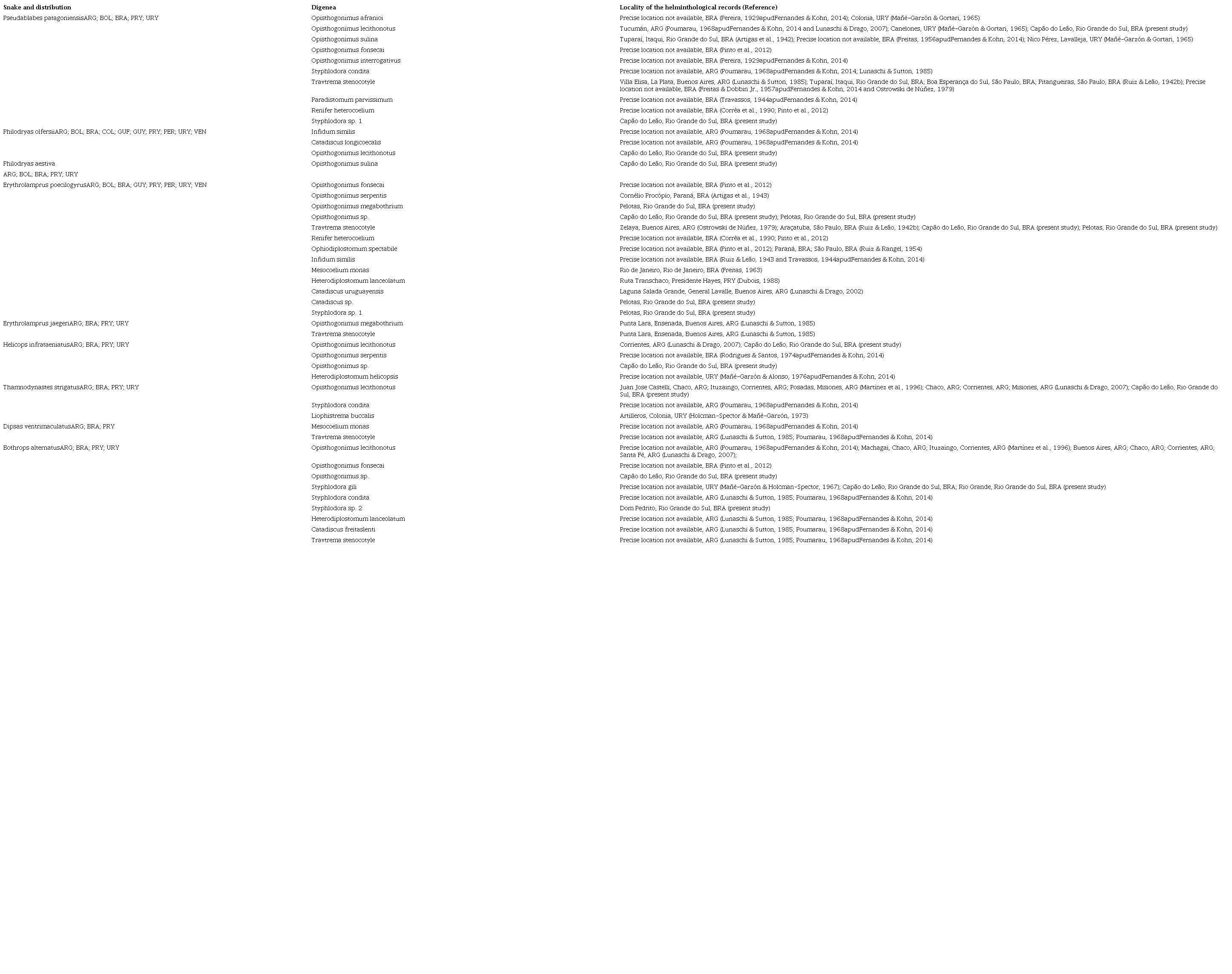 All snakes analyzed in this study have a restricted distribution to the South American continent (Uetz et al., 2021). However, most records of Digenea in these hosts are in Argentina and the southeastern and central-western regions of Brazil (Table 1), which highlights the importance of studies in this area.