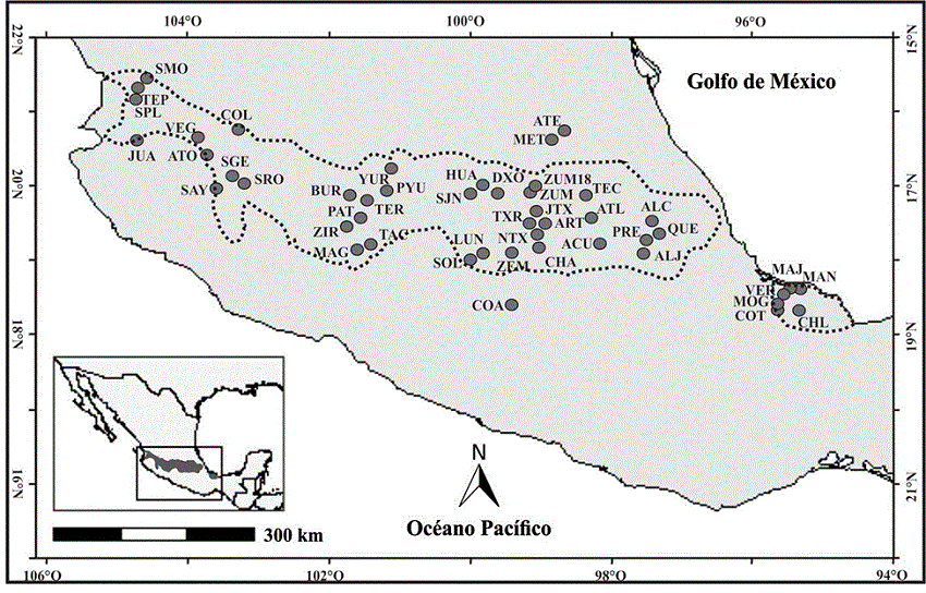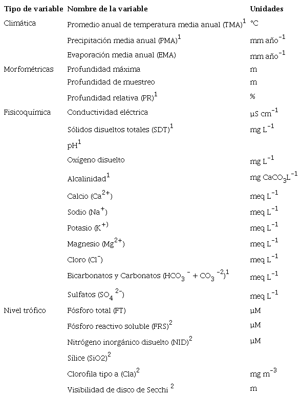 En el presente estudio se incluyen datos de 46 cuerpos de agua ubicados en la Faja Volcánica Transmexicana (FVTM) (fig. 1, tabla 1). Estos sitios forman parte de la base de datos de diatomeas modernas del centro de México del Laboratorio de Paleolimnología, Instituto de Geofísica, UNAM (Avendaño et al., 2021; Caballero y Sigala, 2017). Para estos sitios se analizó el contenido de diatomeas en sedimentos superficiales de los lagos, que representan un promedio de las poblaciones presentes en el lago durante los últimos meses. También se analizaron las variables ambientales de los lagos agrupadas en diferentes categorías: a) climáticas, b) morfométricas, c) fisicoquímicas y d) de nivel trófico (tabla 2), aunque los parámetros en esta última categoría no fueron determinados en todos los sitios. La categoría de cada lago en el espectro de salinidad fue determinada de acuerdo a sus valores de solidos disueltos totales (SDT, Fritz, 2007; Klobe, 1927) y su nivel trófico se determinó con base en sus valores de clorofila a (OECD, 1982).