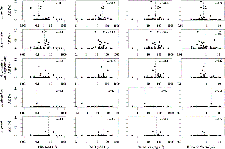 Por su parte, A. pusilla (presente en 3 sitios) muestra una afinidad por valores elevados de sílice, FRS, y clorofila a, así como por aguas con valores bajos de visibilidad de Secchi. Los óptimos estimados para clorofila a y FRS son los más elevados (59.9 mg m-3, 4.3 µM). En la literatura existen pocas referencias a las afinidades ecológicas de esta especie, en parte por las dificultades para su correcta identificación; sin embargo, se ha reportado como una diatomea común en ambientes turbios, eutróficos, ricos en fósforo (Denys et al., 2003), en concordancia con lo encontrado en este análisis. La distribución de A. ambigua, A granulata y A. granulata var. angustissima son muy similares, pero el análisis realizado en este trabajo indica que A. granulata tolera concentraciones de FRS más elevadas en comparación con A. ambigua y A. granulata var. angustissima. Afinidades similares fueron reportadas para estas mismas especies en los trabajos clásicos de Kilham y Kilahm (1986) realizados en lagos africanos. En cuanto a salinidad, A. granulata tolera condiciones al límite entre el agua dulce y subsalina (SDT = 500 mg L-1), A. pusilla muestra una posición intermedia (óptimo de 255 mg L-1) mientras que A. ambigua y A. granulata var. angustissima prefieren salinidades menores (óptimos de 112 y 172 mg L-1). También se identificó que entre estas 4 especies, A. granulata es la que tiene preferencia por una mayor PR (el porcentaje que representa la profundidad máxima con respecto al diámetro de un lago), lo que indica que habita preferencialmente en lagos más profundos.
