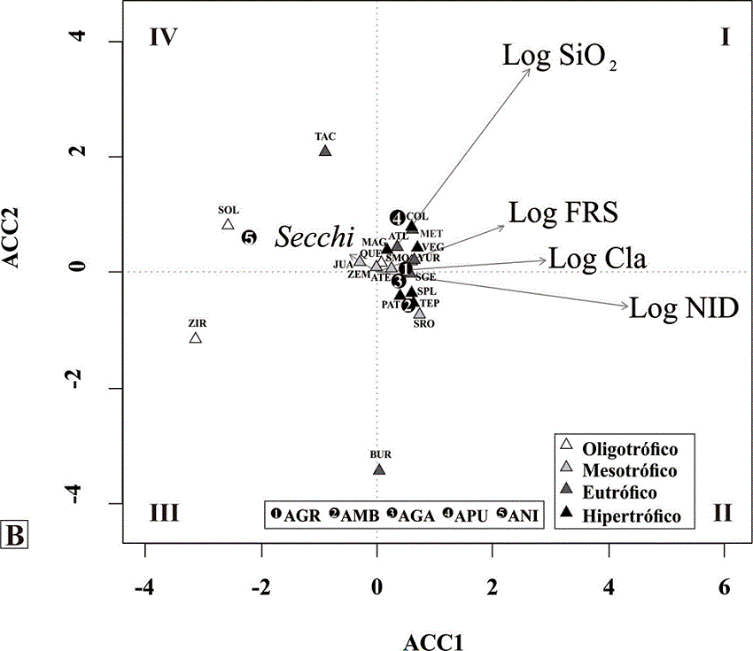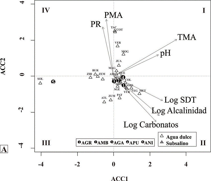 Las preferencias ecológicas de las especies se analizaron graficando las abundancias relativas de cada especie contra variables ambientales selectas y calculando su óptimo de distribución por el método de promedios ponderados en la plataforma R versión 3.6 usando el paquete Optimos.Prime (Sathicq et al., 2020). Por otro lado, también se realizaron análisis de correspondencia canónica (ACC) con las abundancias relativas de las especies y las variables ambientales de los sitios en los que se encontraron ejemplares del género. Los parámetros ambientales fueron seleccionados para evitar covarianza entre ellos. Se realizó un primer ACC con un bloque de 7 variables climáticas, morfológicas y fisicoquímicas (tabla 2) de los 29 sitios en los que estuvo presente el género. Por otro lado, se realizó un segundo ACC con 5 variables de nivel trófico disponibles para 27 de los 29 sitios en los que estuvo presente el género (tabla 2). Para los ACC, las variables fisicoquímicas y de nivel trófico (salvo por el pH y la visibilidad de Secchi) fueron transformadas mediante logaritmo (log10). Estos análisis se realizaron en la plataforma R versión 3.6 usando el paquete Vegan (Oksanen et al., 2020).
