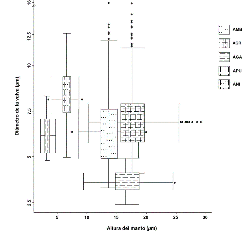 Se determinaron 4 especies y una variedad del género Aulacoseira presentes en 29 de los 46 sitios analizados a lo largo la FVTM: A. ambigua, A. granulata, A. granulata var. angustissima, A. nivaloides y A. pusilla. Los datos resumidos de las mediciones realizadas se presentan en la tabla 3 y en la figura 2 se muestra un diagrama de caja y doble bigote que muestra la variabilidad del tamaño valvar de las especies y variedades del género. En esta gráfica se puede identificar que A. nivaloides y A. pusilla se distinguen por tener el manto más corto, ubicadas a la izquierda de la gráfica, mientras que A. granulata var. angustissima se distingue por su diámetro menor, hacia la parte baja de la gráfica, aunque hay un traslape importante con la variedad nominal. En términos generales A. granulata tiene valvas con manto más desarrollado que A. ambigua, pero existe un traslape importante en el tamaño valvar de las 2 especies.