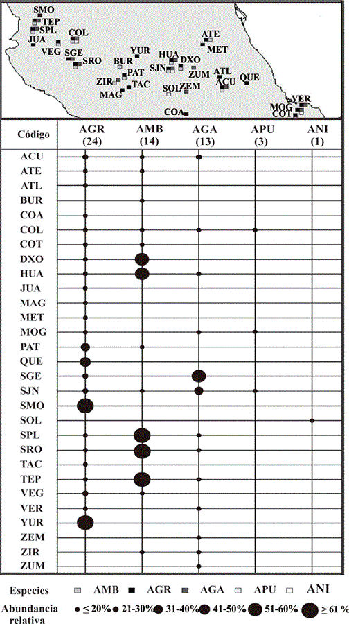 La segunda especie más frecuente fue A. ambigua, presente en 48% de los sitios en los que se registró el género y en 30% de los lagos estudiados. Sus abundancias relativas fueron las más altas, ya que fue dominante en 5 sitios: Santa Rosa (89%), San Pedro Lagunillas (63%), La Huaracha (59%), Danxhó (56%) y Tepetiltic (55%). Las especies con menor frecuencia fueron A. pusilla, que se identificó solo en 3 sitios (6.5% del total de lagos) y A. nivaloides, que estuvo presente en solo 1 sitio (2% del total de lagos). Estas especies nunca fueron dominantes; A. pusilla tuvo su abundancia relativa más alta en San Juanico (19%) mientras que A. nivaloides tuvo una abundancia de 14% en el único sitio en el que estuvo presente (El Sol).