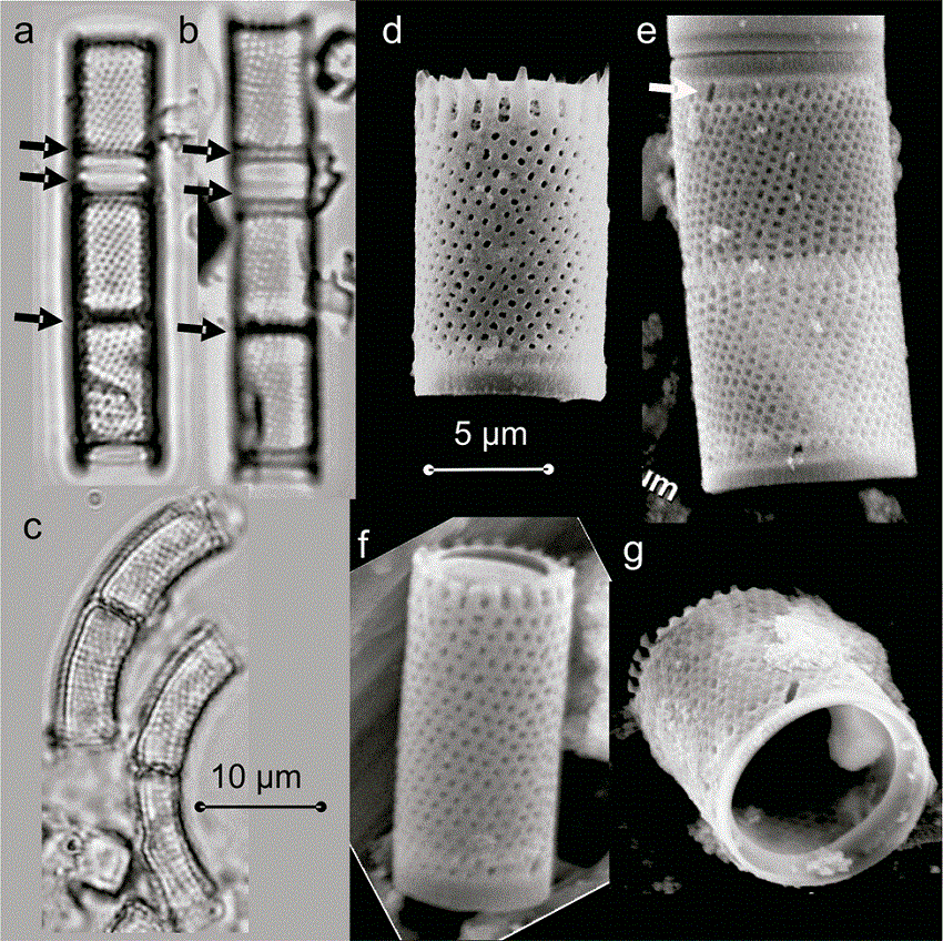 Frústulos cilíndricos con manto desarrollado (fig. 4a-g) que presentan areolas redondas a elongadas, formando hileras curvadas hacia la derecha con respecto al eje pervalvar (fig. 4a-f). La cara valvar es plana a ligeramente convexa, lisa y frecuentemente sin areolas, aunque algunas valvas de separación pueden tener areolas en el margen (Siver y Kling, 1997) (fig. 4f). Las valvas tienen espinas marginales sobre las costillas que separan las hileras de areolas del manto (fig. 4d) y que permiten la formación de cadenas o filamentos, ya sean rectos (fig. 4a, b) o curvos (fig. 4c). Las valvas conectantes o de unión se caracterizan por tener espinas cortas de forma triangular o bifurcada con lóbulos redondeados (fig. 4e) y las valvas desconectantes o de separación (al final de la cadena) por espinas triangulares pequeñas y afiladas (fig. 4d) (Joh, 2010; Potapova et al., 2008; Siver y Kling, 1997). El engrosamiento interno del anillo liso del manto (ringleiste) es hueco y corto (fig. 4g) y al microscopio óptico se observa como un angostamiento que corresponde al sulco en forma de letra “U” (fig. 4b) (Bicudo et al., 2016; Joh, 2010; Pereira et al., 2013; Siver y Kling, 1997). De igual manera, el pseudosulco con forma de letra “V” (fig. 4a, b), es distinguible en la zona de contacto entre 2 valvas adyacentes. Las valvas tienen por lo menos una protuberancia labiada (rimoportula) con una apertura exterior de forma elongada (fig. 4e, g) que se localiza al final de una de las hileras de areolas, a la altura del anillo liso del manto (Cho, 1999; Potapova et al., 2008; Siver y Kling, 1997). En este anillo se distribuyen irregularmente pequeñas protuberancias de sílice.