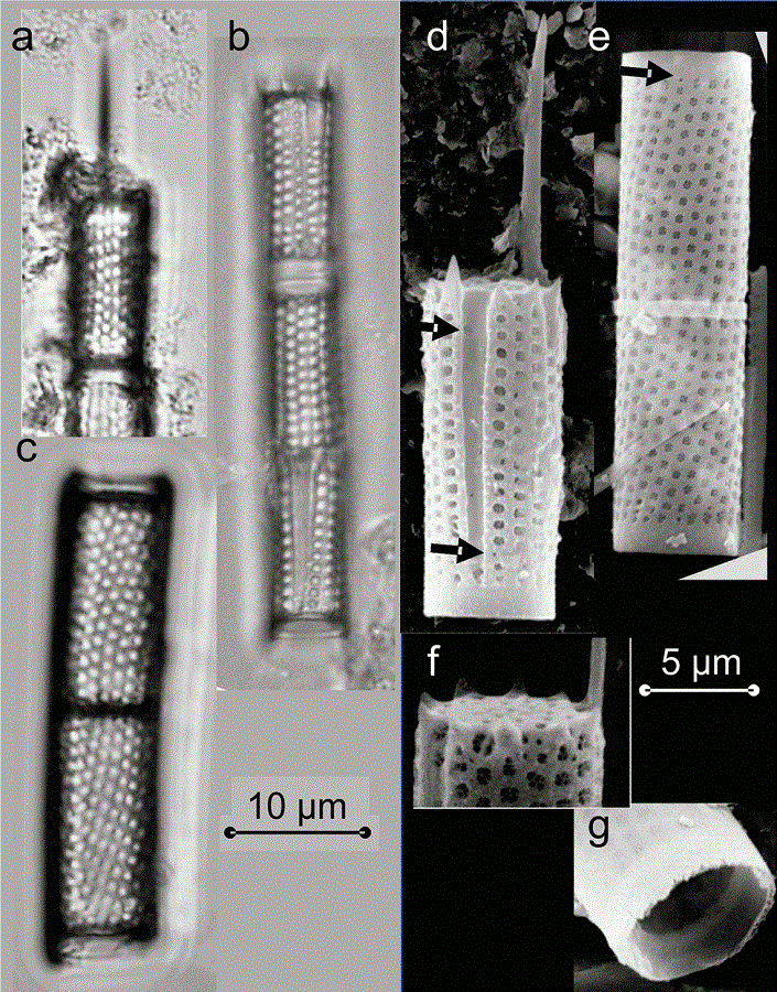 Frústulos cilíndricos con manto profundo (fig. 5a-e) y cara valvar plana, que en las valvas de separación puede tener poros finos distribuidos homogéneamente (fig. 5f). Las valvas tienen espinas marginales que permiten la formación de cadenas o filamentos cortos, rectos o curvos. Las valvas de unión (dentro de la cadena, fig. 5c, e) tienen espinas cortas, planas, triangulares, sobre las costillas que separan las hileras de areolas del manto. Las valvas de separación (al final de la cadena), tienen espinas cónicas que se originan de la fusión de 2 costillas (fig. 5f); con 1 a 3 espinas tan largas como la altura del manto (figs. 5a, d), y que corresponden con un surco o sutura en la valva adyacente (fig. 5b, d) (Tucci et al., 2006; Potapova et al., 2008; Joh, 2010). El manto presenta areolas redondeadas a cuadradas, formando hileras que pueden ser rectas en las valvas de separación (figs. 5b, d) o curvadas a la derecha con respecto al eje pervalvar en las valvas de unión (fig. 5c, e). El engrosamiento interno del anillo liso del manto (ringleiste) es sólido y corto (fig. 5g). Las protuberancias labiadas (rimoportulae) se ubican a 2 o 3 areolas del anillo liso del manto, aunque también es posible observarlas a 2 o 3 areolas de la cara valvar y en las células de separación pueden observarse en la ranura de la espina larga (fig. 5d). El anillo liso del manto se encuentra ornamentado con pequeñas protuberancias de sílice (Siver y Kling, 1997).