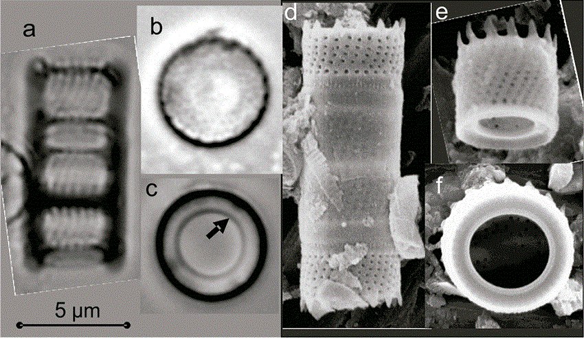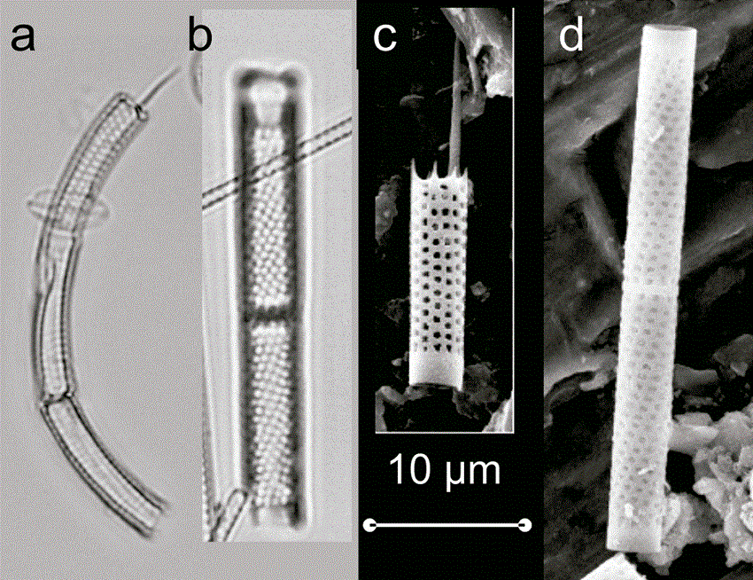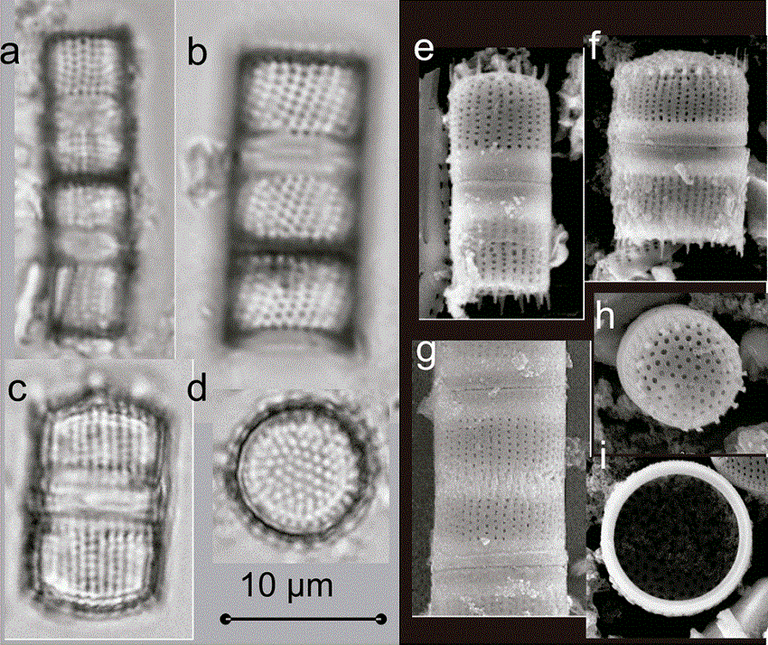 El género Aulacoseira Thwaites incluye más de 122 especies (Guiry y Guiry, 2020), las cuales se encuentran ampliamente distribuidas en ambientes epicontinentales modernos, así como en el registro fósil desde el Cretácico Tardío (~100 millones de años). Entre las principales características morfológicas del género destacan la forma cilíndrica del frústulo, con un manto desarrollado y ornamentado, en donde las areolas van de redondeadas a rectangulares y pueden tener un arreglo lineal a helicoidal (Buczkó et al., 2010; Kociolek et al., 2014; Lee y Yoon, 1994). La ornamentación del manto termina en un anillo liso (collum), que internamente puede estar engrosado (ringleiste) y que frecuentemente se asocia con la presencia de protuberancias labiadas (rimoportulae). La cara valvar puede ser plana a ligeramente curvada y tiene espinas marginales que permiten la unión de valvas adyacentes, formando cadenas o filamentos, que pueden ser rectos, curvos o incluso en espiral (Krammer y Bertalot, 1991; Round et al., 1990; Tucci et al., 2006; Joh, 2010).