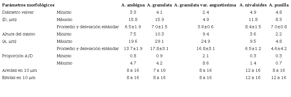 La forma de la valva de los 5 taxones del género Aulacoseira identificados en el presente estudio, permite identificar 2 grupos de especies, las de manto corto (< 8 mm) y relaciones A/D bajas (£ 1) que incluyen a A. pusilla y A. nivaloides, y las de manto alto o profundo y relaciones A/D mayores (> 1) que incluyen a A. ambigua, A. granulata y A. granulata var. angustissima. La especie con el tamaño valvar más pequeño, y con el manto menos desarrollado, es A. pusilla, mientras que A. nivaloides tiene valvas un poco más grandes y cuadradas. En promedio A. granulata tuvo las valvas de mayor tamaño, y sobre todo con mantos más profundos comparados con A. ambigua, aunque existe un amplio traslape de rangos entre ambas especies. La variedad A. granulata var. angustissima se distingue por su diámetro menor (< 4 mm), y relaciones A/D altas (> 3); sin embargo, los ejemplares estudiados tuvieron una elevada variabilidad morfológica con un amplio traslape con la variedad nominal (fig. 2).