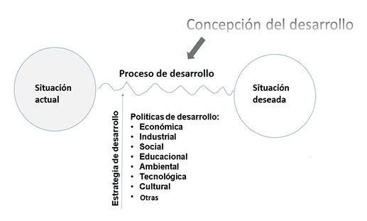 La asimilación pasiva, acrítica, de las teorías del desarrollo internacionalmente divulgadas, puede devenir en un limitante para las economías que se proponen diseñar sus propios procesos de desarrollo en correspondencia con los intereses y objetivos nacionales.2 Debe tenerse presente que según la concepción de desarrollo asumida por un país será la estrategia de desarrollo a trazar y la variedad de políticas que la conformen; estas últimas adquieren mayor o menor protagonismo en función del cumplimiento de los objetivos propuestos y están influenciadas por la propia dialéctica del proceso de desarrollo, de por sí contradictorio (Figura 1).
