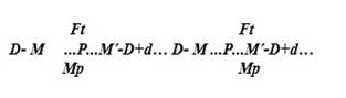 El empresario invierte su dinero (D) en comprar las mercancías (M) (fuerza de trabajo [Ft] y medios de producción [Mp]); y en el proceso de producción [P] es donde se obtiene la mercancía incrementada con la plusvalía [M´], que se realiza como dinero incrementado (D + d). Este movimiento se reproduce una y otra vez como se puede apreciar en el esquema del capital financiero que subordina al capital industrial.