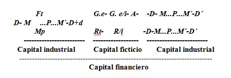 Pero este ciclo del capital industrial, una vez que surge el capital ficticio, llega a estar subordinado al movimiento del capital financiero, el que no es totalmente independiente del movimiento del capital industrial, como se afirma con cierta frecuencia por algunos autores. En todo caso, las formas más complejas de desarrollo del capital subordinan a las menos complejas del capital. En este sentido es que se puede afirmar que el movimiento del capital financiero subordina al movimiento del capital industrial, incluso lo engloba, como se muestra a continuación: