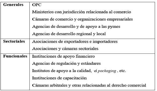 Frente a la volatilidad y las fallas del mercado, las institución de apoyo al comercio (IAC) representan un sólido aliado para las mipymes exportadoras, cuyas acciones generan determinados niveles de fortalezas en áreas claves, a la vez que ofrecen asistencia técnica y mecanismos de facilitación, motivo de reducir los costos de transacción para empresa vulnerables u otras con condiciones desfavorables.