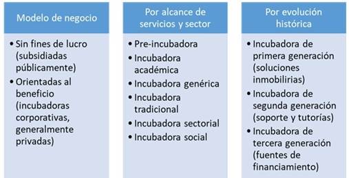 2007; Lalkaka, 2002; Bruneel et al., 2012; Incubadora de Empresas, 2014). Dentro de las tipologías de incubadoras de empresa más reiteradas en la literatura se encuentran: