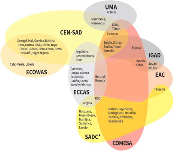El número de estas iniciativas supera ampliamente los grupos de integración regional más significativos en el continente, es decir, los ocho formalmente reconocidos por la Unión Africana (UA) y denominados oficialmente como Comunidades Económicas Regionales (CER): la Comunidad Económica de los Estados de África Occidental (ECOWAS-CEDEAO), en 1975; la Comunidad Económica de los Estados de África Central (ECCAS-CEEAC), en 1983; la Unión del Magreb Árabe (AMU-UMA), en 1989; la Comunidad de Desarrollo de África Austral (SADC), en 1992; el Mercado Común de África Oriental y Austral (COMESA), en 1994; la Autoridad Intergubernamental para el Desarrollo (IGAD), en 1996; la Comunidad de Estados Sahelo- Saharianos (CEN-SAD), en 1998; y la Comunidad de África Oriental (EAC), en 1999. El tamaño de estas CER varía desde las más pequeñas, como AMU-UMA e IGAD con 5 y 8 países miembros, hasta las más grandes, como CEN-SAD y COMESA, con 25 y 21 respectivamente (Figura 1).