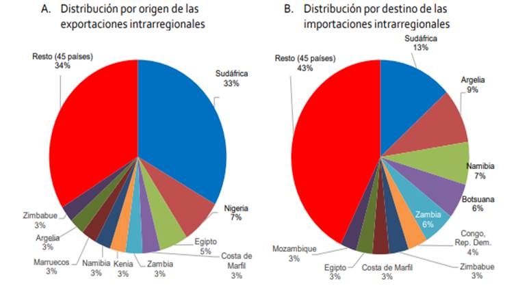 Un comercio intraafricano altamente concentrado en pocos países. Este es el caso particularmente de las exportaciones: en promedio, entre 2017 y 2019, un tercio de ellas provino de Sudáfrica; otro tercio, de las economías que se ubican del segundo al décimo lugar entre los principales exportadores intraafricanos; y el tercio restante, de los otros 45 países del continente (Figura 2). La distribución por destino de las importaciones intraafricanas también muestra una elevada concentración por países, aunque menor que la de las exportaciones. Al igual que en el caso de estas, Sudáfrica es el principal importador desde el continente, 13 pero los 10 principales importadores representaron solo el 57 % del total entre 2017 y 2019. En términos relativos, la importancia del mercado regional varía mucho según el país. Cabe destacar la participación promedio inferior al 4 % que ha tenido África en las importaciones totales de la primera y tercera economías del continente, Nigeria y Egipto, respectivamente, en el trienio 2017 a 2019 (Herreros, 2021).