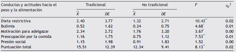 Las medias y desviaciones estándar de los grupos (tradicional vs. no tradicional) se pueden consultar en la tabla 2. Los resultados multivariados identificaron diferencias de magnitud pequeña entre los grupos (lambda de Wilks = 0.968, F [6/385] = 2.151, p < 0.05, ), mientras que los análisis univariados mostraron diferencias significativas, pero también pequeñas, en cuanto a la puntuación total del EAT-40 y en sus factores: Dieta restrictiva, Preocupación por la comida y Bulimia. Sin embargo, no se registraron diferencias entre los grupos respecto a la Motivación para adelgazar o la Presión social percibida. Así, las adolescentes del contexto tradicional manifestaron que restringen más su dieta, experimentan mayor preocupación por la comida, realizan más conductas compensatorias y, en general, presentan más actitudes y conductas negativas hacia el peso y la alimentación que las adolescentes del contexto no tradicional.