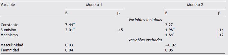 El análisis de regresión se realizó con el total de participantes, es decir, en este análisis se incluyó a las adolescentes de ambos contextos (N = 392). Se llegó al modelo final tras dos pasos. En el paso uno se incluyó la variable Sumisión (F [1,390] = 9.20, p < 0.004; R 2 corregida = 0.02), mientras que en el paso dos se agregó al modelo la variable Machismo (F [1,389] = 6.70, p < 0.02; R 2 corregida = 0.03, ΔR 2 = 0.01). Los resultados se exponen en la tabla 3, y muestran que por cada unidad de incremento en Sumisión, las actitudes negativas hacia la alimentación aumentaron 1.96 unidades; mientras que por cada unidad de incremento en Machismo, las actitudes negativas hacia la alimentación aumentaron 1.64 unidades. Por tanto, mayores puntuaciones en Sumisión y Machismo se asociaron a actitudes y conductas más negativas hacia el peso y la alimentación.