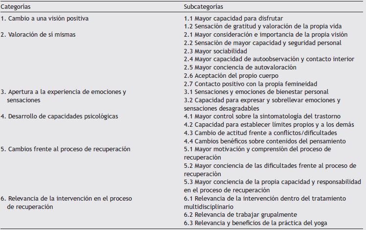 Además, los resultados del presente estudio son coincidentes con los de Gootjes et al. (2011), quienes encontraron que la práctica de meditación yóguica se asocia a una mayor regulación emocional e incremento de los pensamientos positivos; así como con el estudio de Foltz-Gray (2007), quien señala que con la práctica del yoga las personas comienzan a reconectarse con sensaciones desagradables, al asumir que dicha incomodidad solo es transitoria. En este sentido, las participantes de este estudio enunciaron tener una mayor apertura a la experiencia, con aumento en la capacidad de disfrutar y sobrellevar las emociones negativas. Al respecto, cabe destacar que las dificultades en la regulación emocional es una de las principales características de las pacientes con TCA, siendo el peso y el cuerpo las vías a través de las cuales regulan las emociones negativas (Cruzat y Cortez, 2008; Cruzat et al., 2010).