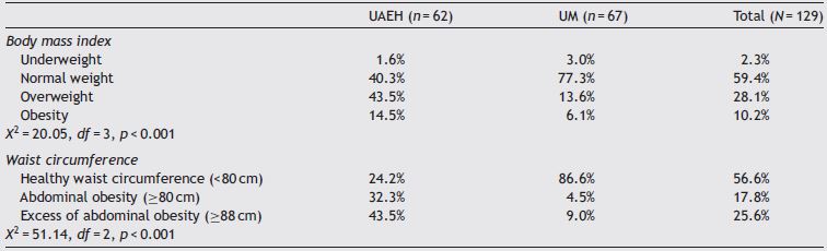 Findings of BMI showed that UAEH participants reached a higher percentage of overweight and obesity than UM students with a statistically significant difference (X2 =20.05, df = 3, p < 0.001). With respect to WC, UAEH students achieved the highest percentage of abdominal obesity (32.3% and 43.5%, respectively) with statistically significant difference (X2 = 51.14, df =2, p < 0.001). These findings are displayed in Table 1.