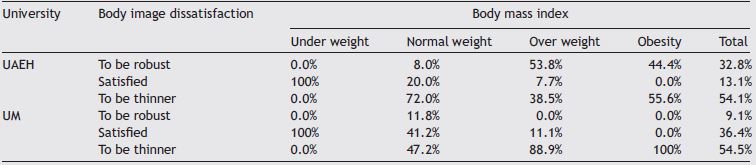 Table 2 shows a very low percentage of UAEH students who are satisfied versus almost three times of the UM students who are satisfied. In both samples, dissatisfaction in the sense of wanting to be thinner was very similar (54.1% UAEH vs. 54.5% UM). However, it is interesting to comment that UAEH women with normal BMI are the most dissatisfied in the sense of wanting to be thinner; meanwhile, UM students with overweight and obesity reported the highest percentages of dissatisfaction in this sense. Other results that must be commented are the high percentage of UAEH participants with overweight and obesity who want to be stouter.