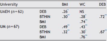 The correlations in both samples indicated that higher levels of DEB were related to higher levels of BTHIN. This latter variable and the anthropometric indicators showed modest but statistically significant correlations in both samples. In general, was observed that values in the UM students were higher than in UAEH students. Additionally, UM students reported a statistically significant association between DEB and WC. These results are showed in Table 3.