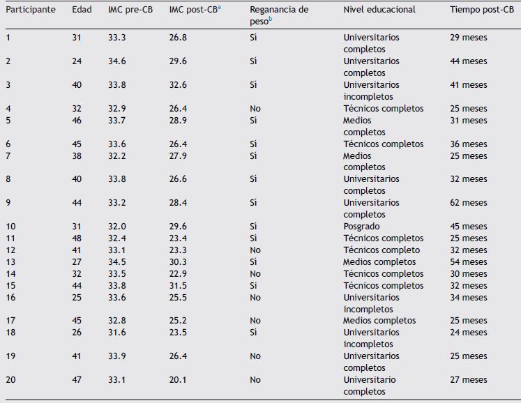 La muestra final quedó conformada por 20 mujeres, de entre 21 y 49 años de edad (M = 36.85 DE = 7.65), con 24 a 62 meses post-CB (M = 32.7, DE = 9.79). Pre-CB, el IMC promedio fue 33.3 (DE = 0.78), y post-CB fue 26.6 (DE = 3.10). La mayoría de las pacientes manifestó tener obesidad a partir de la adultez (80%), y un porcentaje menor desde la infancia (15%) o la adolescencia (5%). En su mayoría las pacientes contaban con pareja (75% casadas, convivientes o con una relación sentimental); 35% tenía estudios universitarios completos, 30% con enseñanza media completa, 20% con enseñanza técnica completa, 10% con enseñanza universitaria incompleta, y 5% con posgrado (Tabla 1).