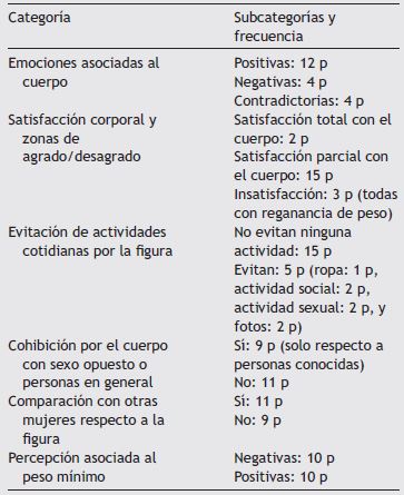 Se presentan las cinco categorías relacionadas con las vivencias asociadas a la imagen corporal, y una categoría emergente relativa a la vivencia del peso mínimo alcanzado. Este, en términos absolutos, es el menor peso presentado por las participantes durante el período post-CB, según registro en la ficha clínica. Aunque todas las pacientes aumentaron de peso, al considerar los criterios internacionales definen reganancia (incremento de peso ≥ al 25% del exceso de peso perdido previamente; Mann, Jakes, Hayden y Barth, 2015), 13 de las 20 pacientes reganaron peso.