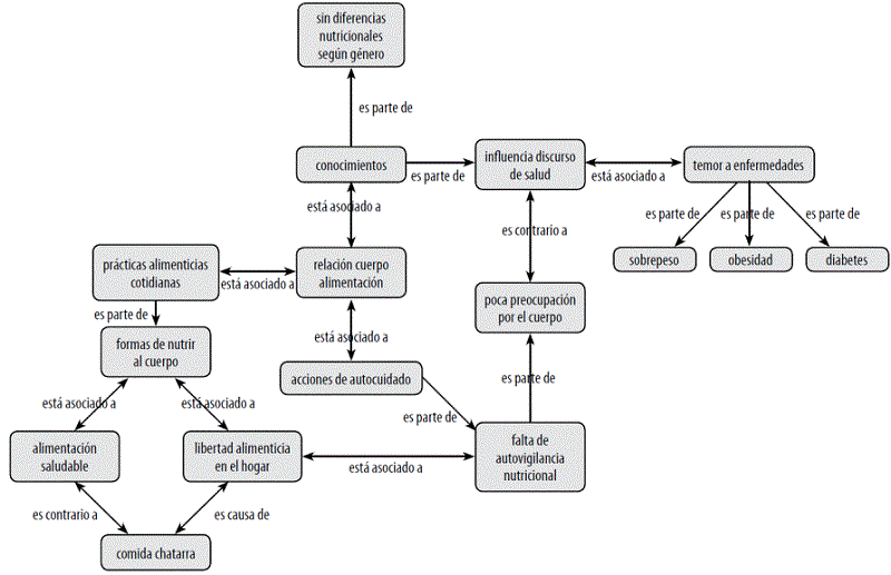 Con respecto a la categoría conocimientos, fue evidente la influencia del discurso médico sobre el cuidado de la salud; por ejemplo, el rechazo a los alimentos altos en grasas, azúcares y sodio, así como la importancia de poseer un cuerpo sano y bello, portador de una autoestima positiva. A diferencia de los dos grupos anteriores, en las madres del ESE alto se visualizaron distinciones entre corporalidad femenina y masculina a partir de la alimentación, esto es que mujeres y hombres deben comer de acuerdo a sus propias necesidades nutricionales y no necesariamente lo mismo. Esto pudo notarse en las viñetas siguientes: