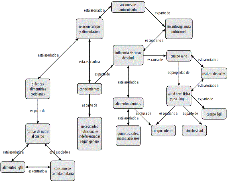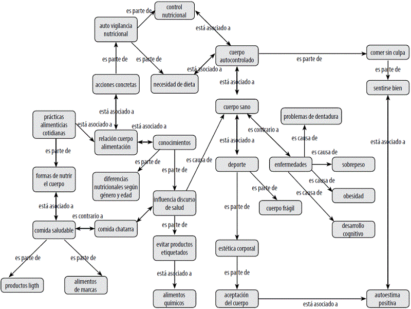 Con lo expresado en el relato general de las madres, el cuerpo aparece como un elemento de mediación familiar, social y cultural, fundamentado esto en el discurso de narrativas mediáticas que proponen las nociones y los modelos de lo exitoso, lo bello y lo sano (Solá-Morales, 2003). Bajo este contexto, la alimentación constituye un elemento central, en donde el qué y para qué comer constituyen preguntas constantes dentro del espectro de la cotidianeidad de las madres, lo que también habla del proceso de feminización del consumo alimentario (Fischler, 1979; Rhodes et al., 2016).