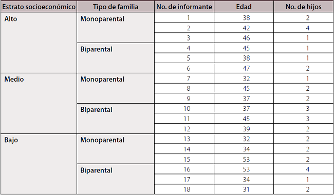 El tipo de muestra de este estudio fue por conveniencia, conformada por 18 madres que cumplieron con los criterios de inclusión siguientes: mayores de 18 años de edad; con hogares mono y biparentales; y pertenecientes a los ESE antes definidos: alto, medio y bajo (seis participantes de cada estrato) del sector urbano de la ciudad de Temuco, región de La Araucanía, Chile. La edad de las participantes fluctuó entre 31 y 53 años (M = 40.4, DE = 6.9), mientras que el número de hijos iba desde uno hasta cuatro, cuyas edades fluctuaron entre 6 y 17 años (Tabla 1).