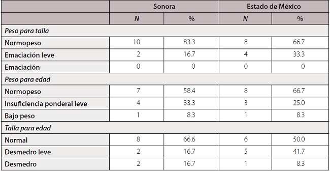 De acuerdo con los tres parámetros empleados para determinar el EN, de los 24 niños evaluados, 16 presentaron algún grado de desnutrición y ocho fueron considerados eutróficos (Tabla 1). De acuerdo con la entidad federativa de procedencia (ES vs. EM), en ninguno de esos parámetros se identificaron diferencias significativas.