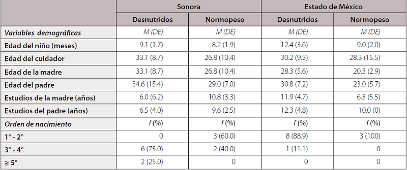 En función del estado de procedencia, la relación entre variables cambió, ya que en el EM las madres de los niños con desnutrición cuentan con mayor grado de escolaridad que las de niños con buen EN, mientras en el ES esta relación se dio a la inversa: las madres de los niños eutróficos reportaron más años de educación formal vs. aquéllas con hijos desnutridos (U = 8.0, p = .09, r = .43). Además de lo anterior, la diferencias de edades que alcanzaron la significancia marginal fueron para el padre en el ES y para la madre en el EM, siendo mayor la edad de los progenitores de niños con desnutrición (U = 5.5, p = .05, r = .42; U = 2.0, p = .04, r = .48, respectivamente). Con lo que respecta al orden de nacimiento de los niños por estado de procedencia, se identificó una diferencia importante, ya que 10 de los niños del ES ocuparon los lugares del tercero en adelante, mientras que 11 de los niños del EM fueron el primero o el segundo hijo (U = 27.0, p = .05, r = .57). Más aún, en el ES se encontró una diferencia significativa en el orden de nacimiento entre los niños desnutridos y los que presentaban una buena condición nutricia (U = 4.0, p = .05, r = .66); diferencia que no fue estadísticamente significativa en la submuestra del EM (U = 9.0, p = .27).
