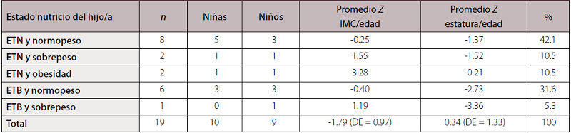 En cuanto al EN de los hijos/as, 42.1% presentó estatura normal (ETN) y normopeso, 36.1% ETB y normopeso, 10.5% ETN y sobrepeso, 10.5% ETN y obesidad, y finalmente, 5.3% ETB y sobrepeso (ver Tabla 1). El promedio del puntaje Z del indicador estatura para la edad fue -1.79 (DE = 0.97), y del IMC para la edad fue 0.34 (DE = 1.33). Así, 26.3% de los niños/as presentaron sobrepeso u obesidad.
