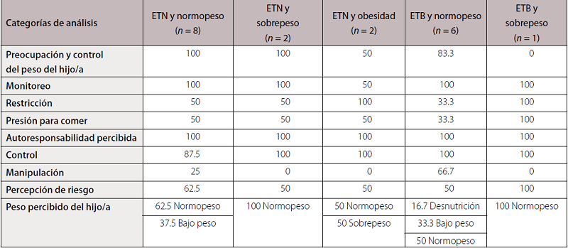 Madres de hijos/as con ETB y normopeso (desnutrición crónica). Estas seis madres se percibieron como las principales responsables de la alimentación de sus hijos/as. En todas estuvo presente el monitoreo, como expresó la madre 6: “Le gusta de todo…casi los dulces no le gustan, galleta o leche sí”, y el control, como se hace notar en el discurso de la madre 8: “Si quiere un chicharrón [fritura] o paleta llora, pero no le compro […] le compro un pan o plátano o manzana”. Además, cinco de estas madres manifestaron preocupación y controlar el peso del hijo/a, como refirió la madre 5: “Si me preocupa que a lo mejor nadie le exige que coma, a lo mejor si come, o a lo mejor anda jugando y no quiere comer”; y cuatro de las madres reportaron manipulación, como expresaron las participantes 11: “Si tenemos pan, le doy” y 6: “Sí, salgo y le compro yogurt”. Tres de las madres percibieron riesgos asociados a la alimentación, es decir, mencionaron que la mala alimentación puede conllevar enfermedades, y principalmente identificaron a la obesidad. Finalmente, en cuanto al peso percibido de su hijo/a, una lo refirió con desnutrición (percepción correcta), dos los percibieron con bajo peso y tres con normopeso.
